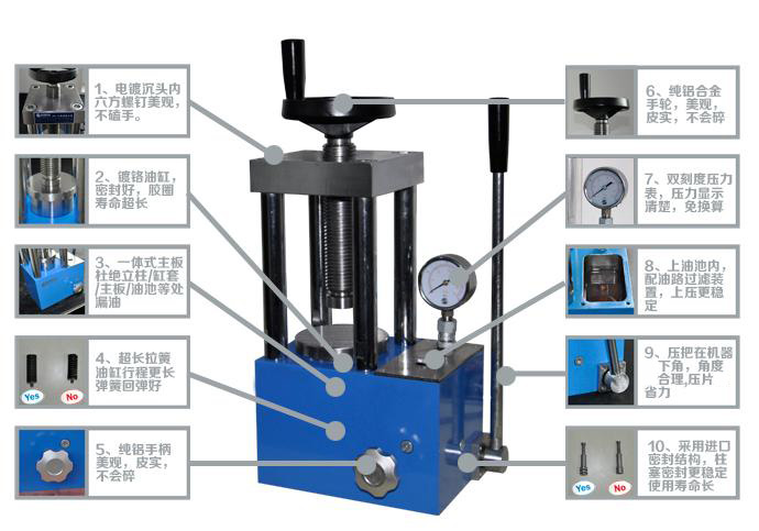 压片机主要用作红外分光光度计或其它仪器压制粉末试片,如压制陶瓷粉末试片等.大量配套各种进口傅立叶红外光谱仪附件.。是国内仅有的不掉压,不漏油的过关产品,质量可取代进口压片机。主油缸截面积0.636dm2.工作压力(吨)=0.636X压力表数(MPa)
